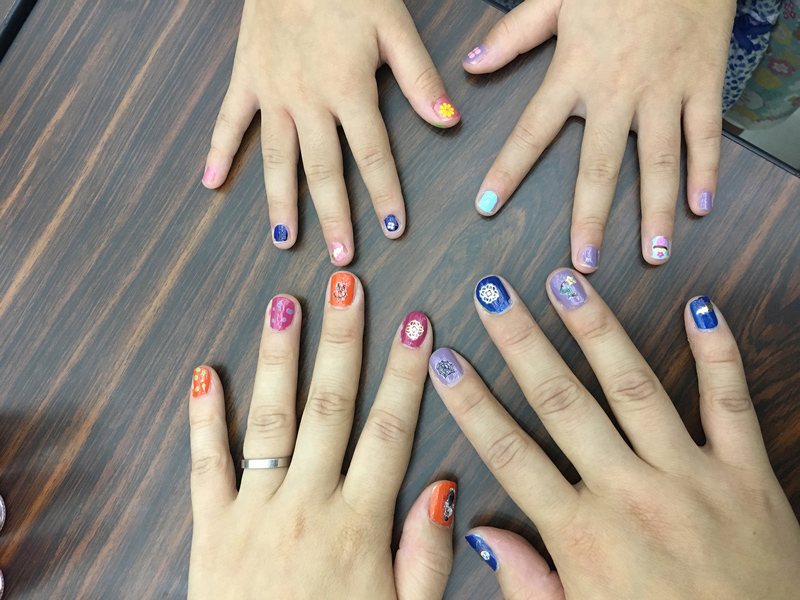 両日とも試し塗りは自由にしていただけたのですが、2日目に何のワークショップもないと楽しめなくない?ってことで、1日の終了後に急遽見本のネイルチップやPOPなどを作成しました。告知もしていなかったのでみなさんに集まっていただけるのか不安でドキドキ。参加しやすいようにサクラを仕込むか?なんて画策する始末^^;