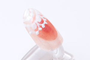 7)胡粉(ごふん)を使って、親指・中指・小指にレース模様を描きます。レースの出発点の爪先に半円を描いて塗りつぶし、それを囲むように1~2ミリ外側に半円の線を描き、線に沿って等間隔に半円を描いて塗りつぶします。